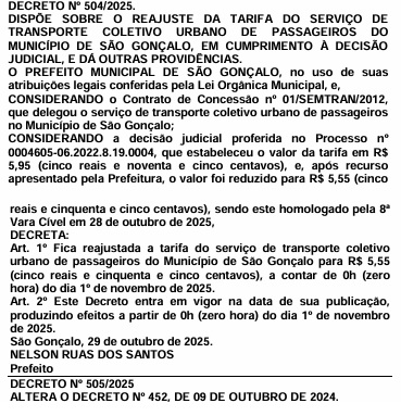 A Prefeitura publicou o decreto municipal com o novo valor na quinta-feira, e o reajuste entra em vigor no primeiro dia de novembro. O aumento impactará diretamente o orçamento dos passageiros gonçalenses, que enfrentarão uma das tarifas mais altas entre os municípios da Região Metropolitana do Rio.